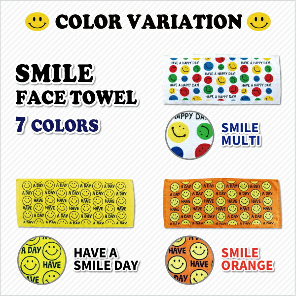 商品名 スマイル フェイスタオル ≪7種類≫ *SMILE MULTI *HAVE A SMILE DAY *SMILE BROWN *SMILING *FLOWER SMILE *SMILE ORANGE *SMILE BLACK サイズ 約34×80cm 素材 コットン100% 商品説明 大人気のスマイル フェイスタオルが入荷しました! キュートなスマイルがデザインされたフェイスタオル ●コットン100%で手触りもふかふかで吸水性もバッチリ。